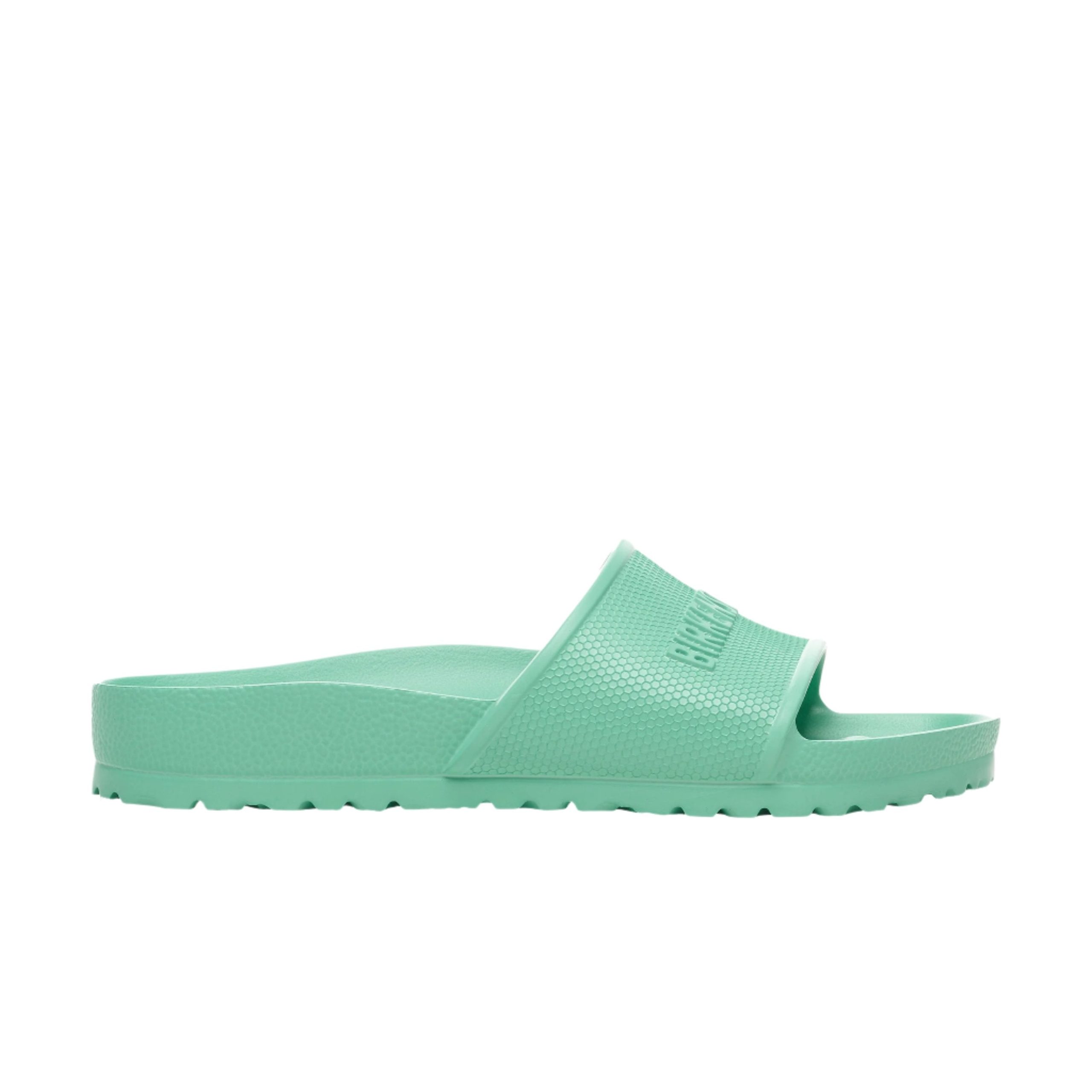 The Birkenstock Barbados is a waterproof lightweight. sporty slide design with a hexagon pattern and logo lettering. Modelled on the cork sandal. this sandal is made from one piece of light. flexible and waterproof moulded EVA.