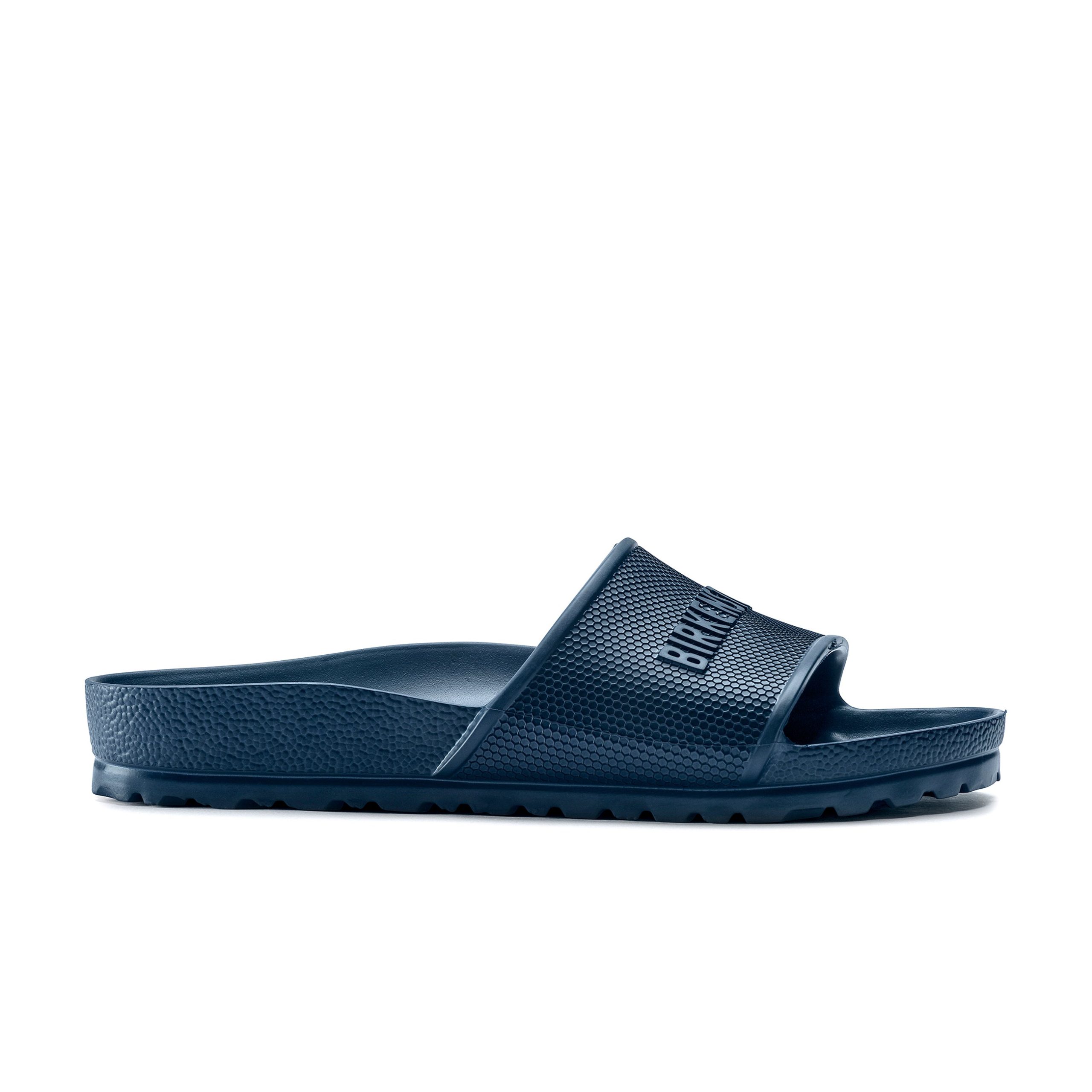 The Birkenstock Barbados is a waterproof lightweight. sporty slide design with a hexagon pattern and logo lettering. Modelled on the cork sandal. this sandal is made from one piece of light. flexible and waterproof moulded EVA.