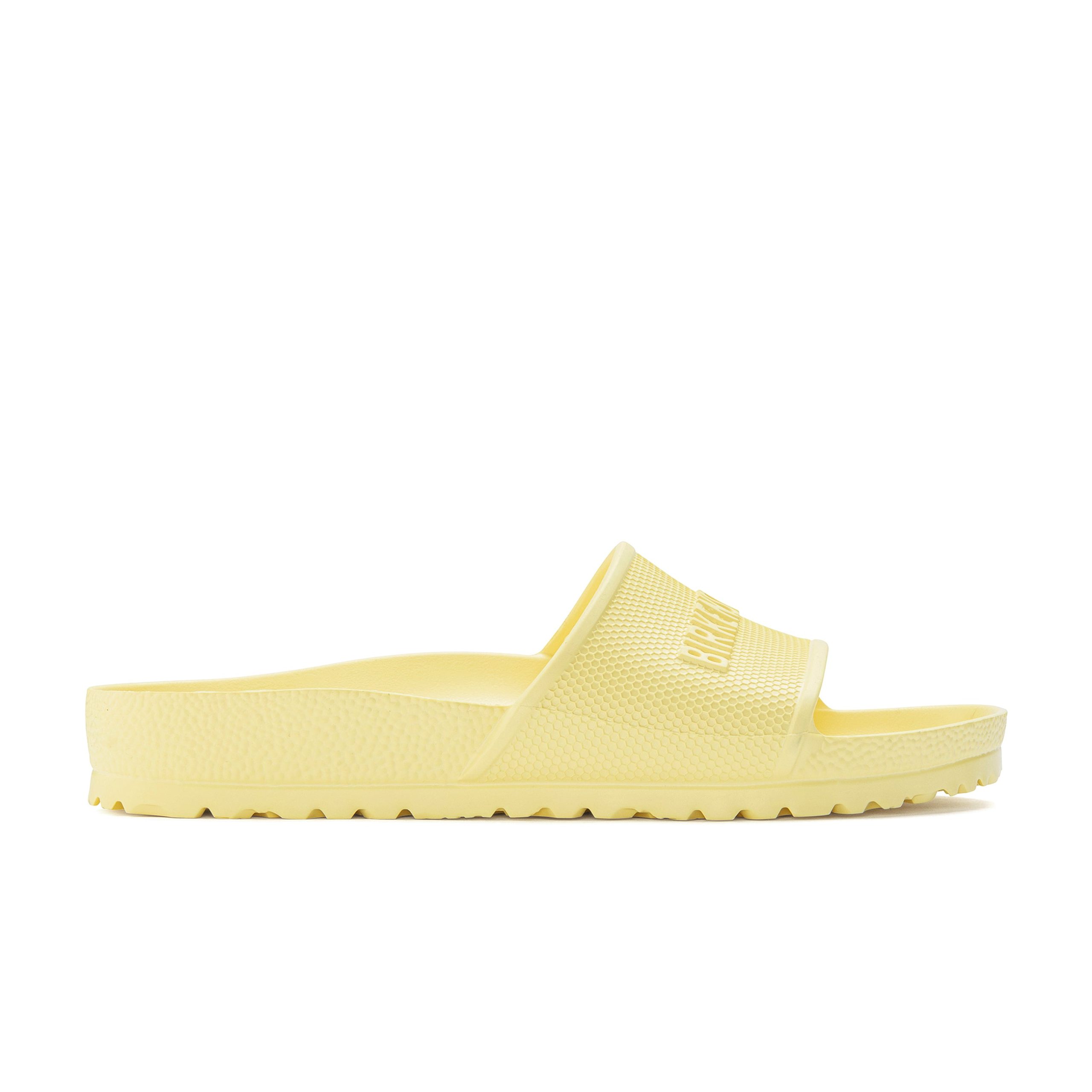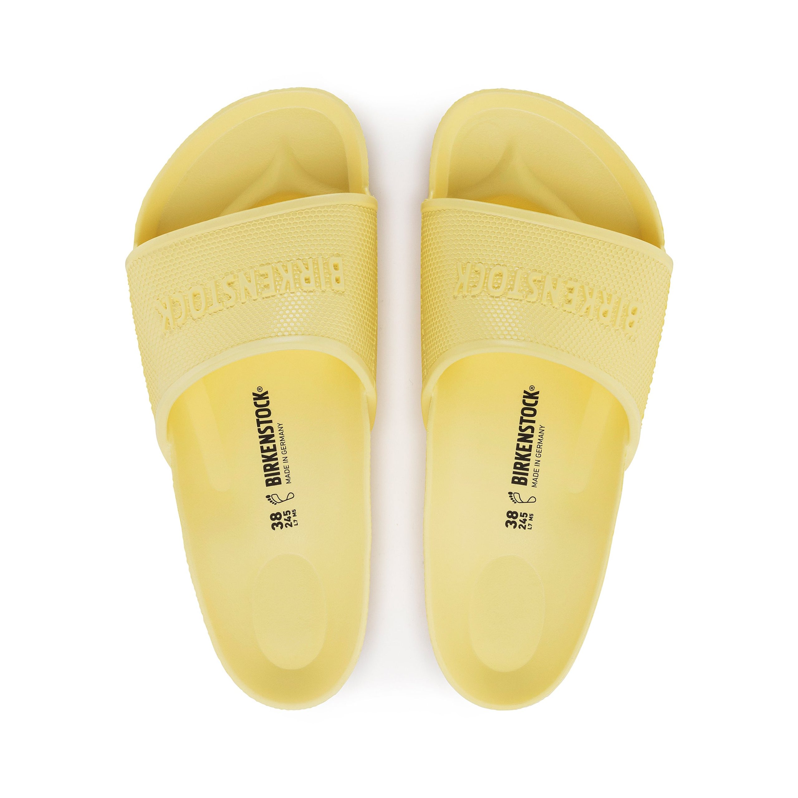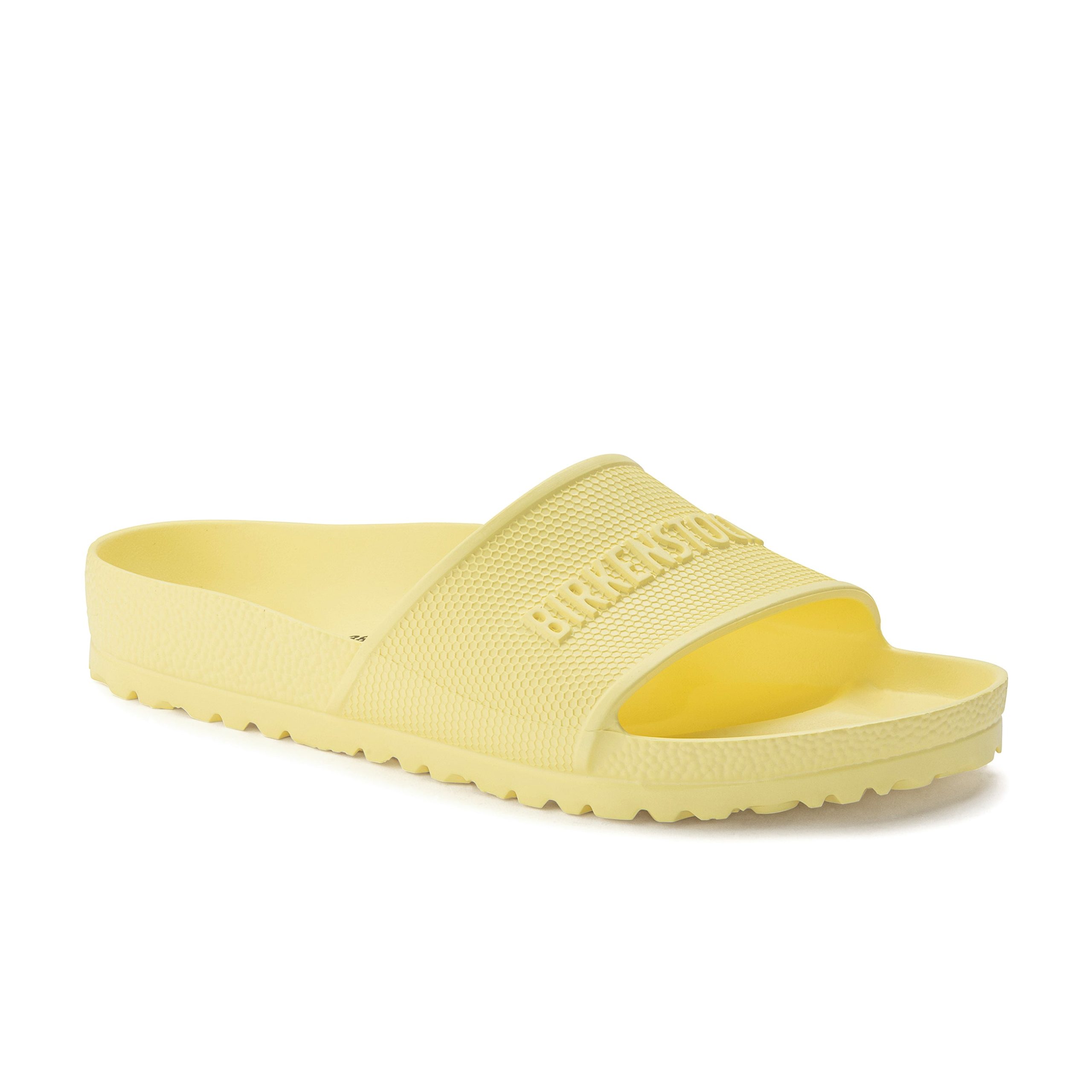 The Birkenstock Barbados is a waterproof lightweight. sporty slide design with a hexagon pattern and logo lettering. Modelled on the cork sandal. this sandal is made from one piece of light. flexible and waterproof moulded EVA.